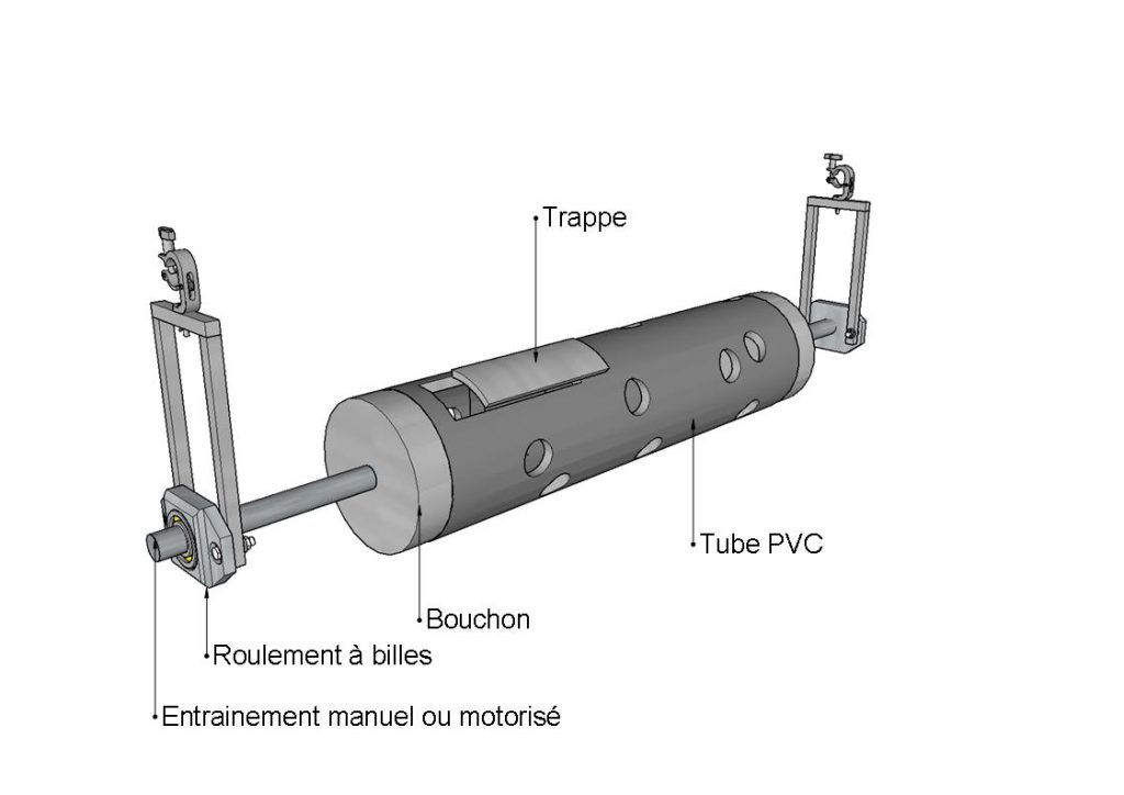 Il s’agit d’un tube réalisé en bois ou métal percé de trous sur la partie haute, remplis de grillages larges éventuellement. Ce tube va basculer d’un côté puis de l’autre grace à une commande actionnée par le machiniste. A chaque fois que le tube bascule, la neige pourra s’écouler par les trous.