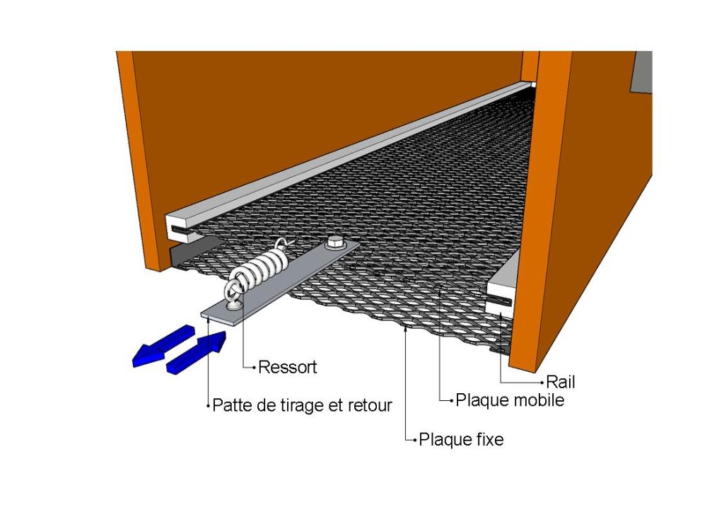 Dans sa partie basse il y a une grille fixe en métal déployé avec juste au-dessus une grille mobile.
