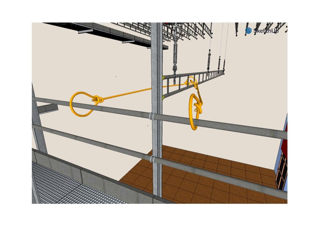 - Attention au point d’accroche des haubans. Typiquement les passerelles dans les théâtre sont souvent suspendues à la charpente et non reprises régulièrement aux murs, si on se prend sur un garde corps de ces passerelles, c’est la passerelle qu’on bride vers le théâtre !!