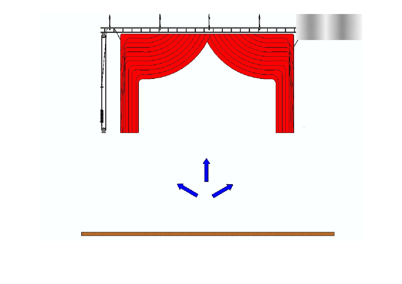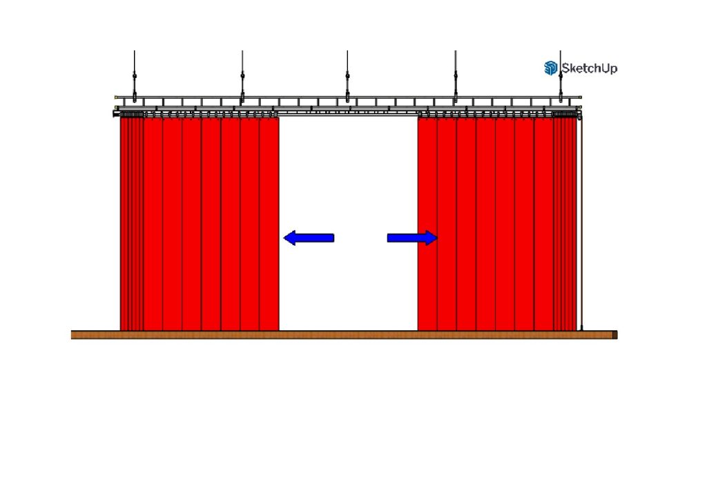 Rideau (à plat ou plissé) à deux pans avec ouverture diagonale vers les angles et levage verticale.