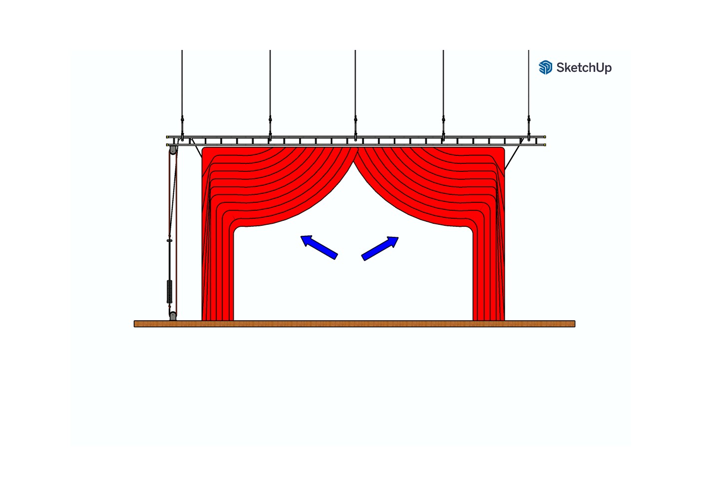 Rideau à deux pans avec ouverture diagonale vers les angles. Une partie du rideau reste visible une fois ouvert