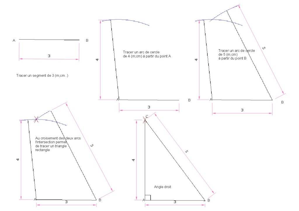 - Si nécessaire, pour s’assurer d’être parallèle à notre ligne repère ou si on a besoin de tracer une perpendiculaire il existe la règle dite du « 3 ;4 ;5 ». Elle reprend le théorème de Pythagore : Dans un triangle rectangle, le carré de la longueur de l’hypoténuse (ou côté opposé à l’angle droit) est égal à la somme des carrés des longueurs des deux autres côtés. A²+B²=C²